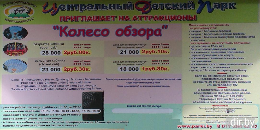 Цена на аттракцион "Колесо обзора" в парке Горького (г. Минск 28 мая 2016)