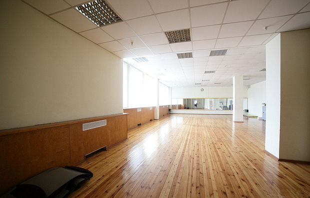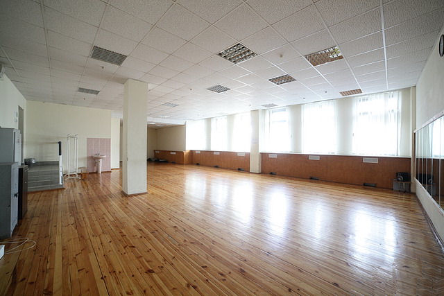 ( 300 кв.м.). Благодаря высокому потолку воздух в любое время года всегда свежий, что благоприятствует проведению занятий. Просторный, прекрасно освещенный зал, где можно проводить занятия по аэробике , шейпингу, спортивным танцам, каратэ, художественной гимнастике.