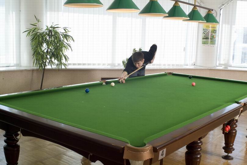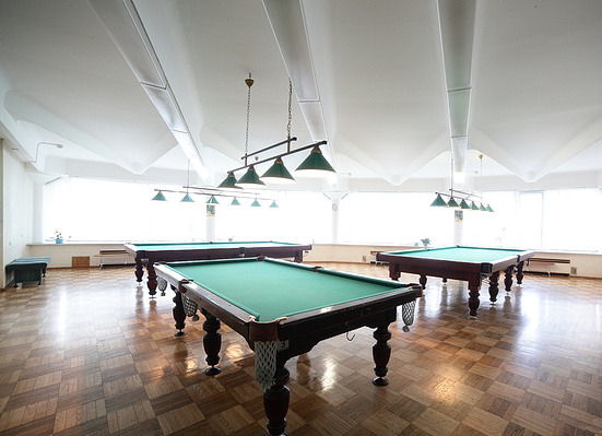 имеет приятную полукруглую форму. В зале установлены два стола для игры в “Пирамиду”, столы для игры в “Пул” и “Снукер”.
