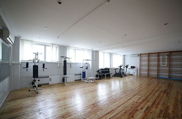 Зал оснащен кондиционерами, беговой дорожкой, тренажерами, гантельным рядом, “шведской” стенкой, инвентарем для занятий ЛФК.