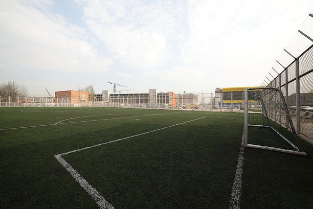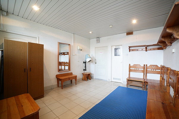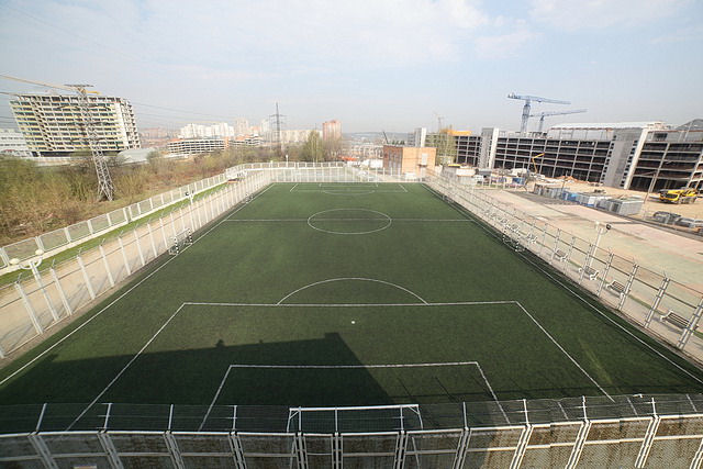 соответствует мировым стандартам. Можно играть в футбол на всем поле и в мини-футбол на двух площадках одновременно. Раздевалки, душевые и туалетные комнаты находятся в здании ФОКа.