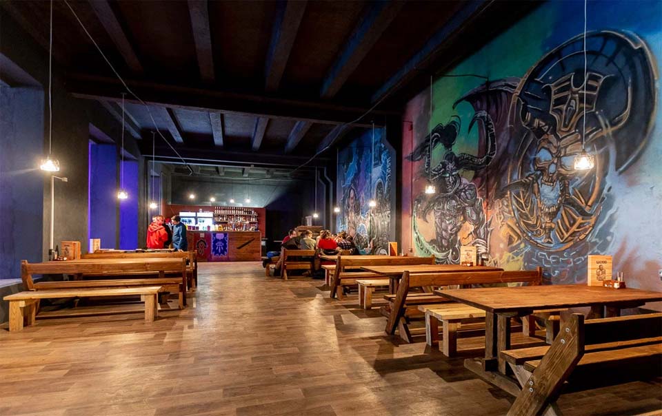 Таверна World of Barcraft (Ворлд оф Баркрафт) представляет собой место для любителей фэнтези, музыки и качественного отдыха. Интерьер выполнен в стилистике средневековой таверны: массивная мебель из натурального дерева и декоративные элементы, создающие ощущение путешествия во времени. Центральным украшением зала является роспись от белорусского художника, изображающая знаковых персонажей вселенной Warcraft. Каждая деталь интерьера продумана до мелочей, чтобы гости могли ощутить себя героями любимой игры.