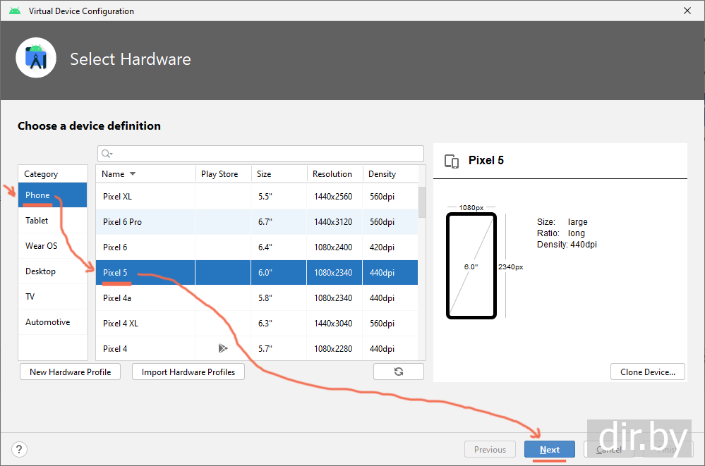 The virtual device will have the characteristics of a real gadget: display diagonal, SD card size, pixel density, and other parameters.