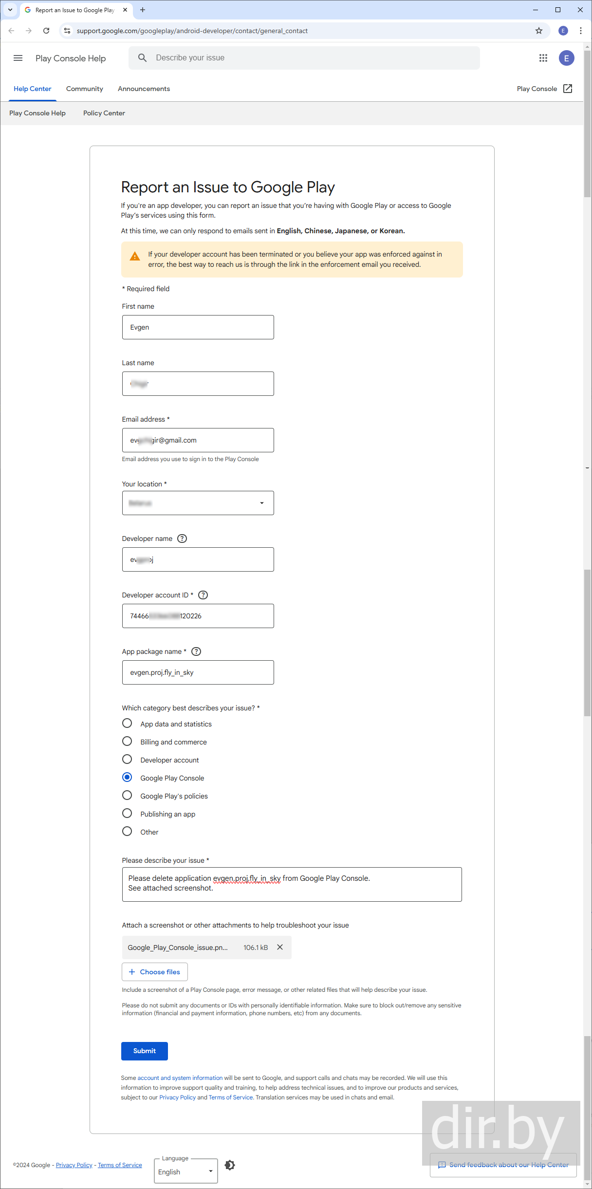 Google Play Developer Console support feedback