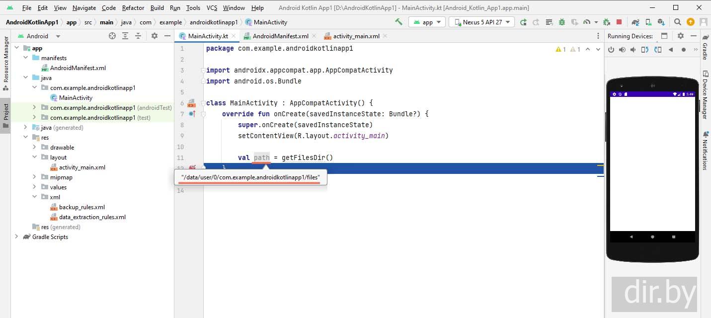 val folderPath = getFilesDir(); // folderPath = "/data/user/0/com.example.androidkotlinapp1/files"
