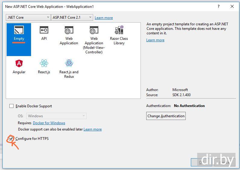Также здесь есть флажок "Configure HTTP". При установке этого флажка проект при отладке и тестировании по умолчанию будет запускаться по протоколу HTTPS. В данном случае установка и не установка этого флажка не имеет значения. Кроме того, даже если мы установили эту отметку, то впоследствии через свойства проекта можно отменить запуск через HTTPS или, наоборот, заново установить.
