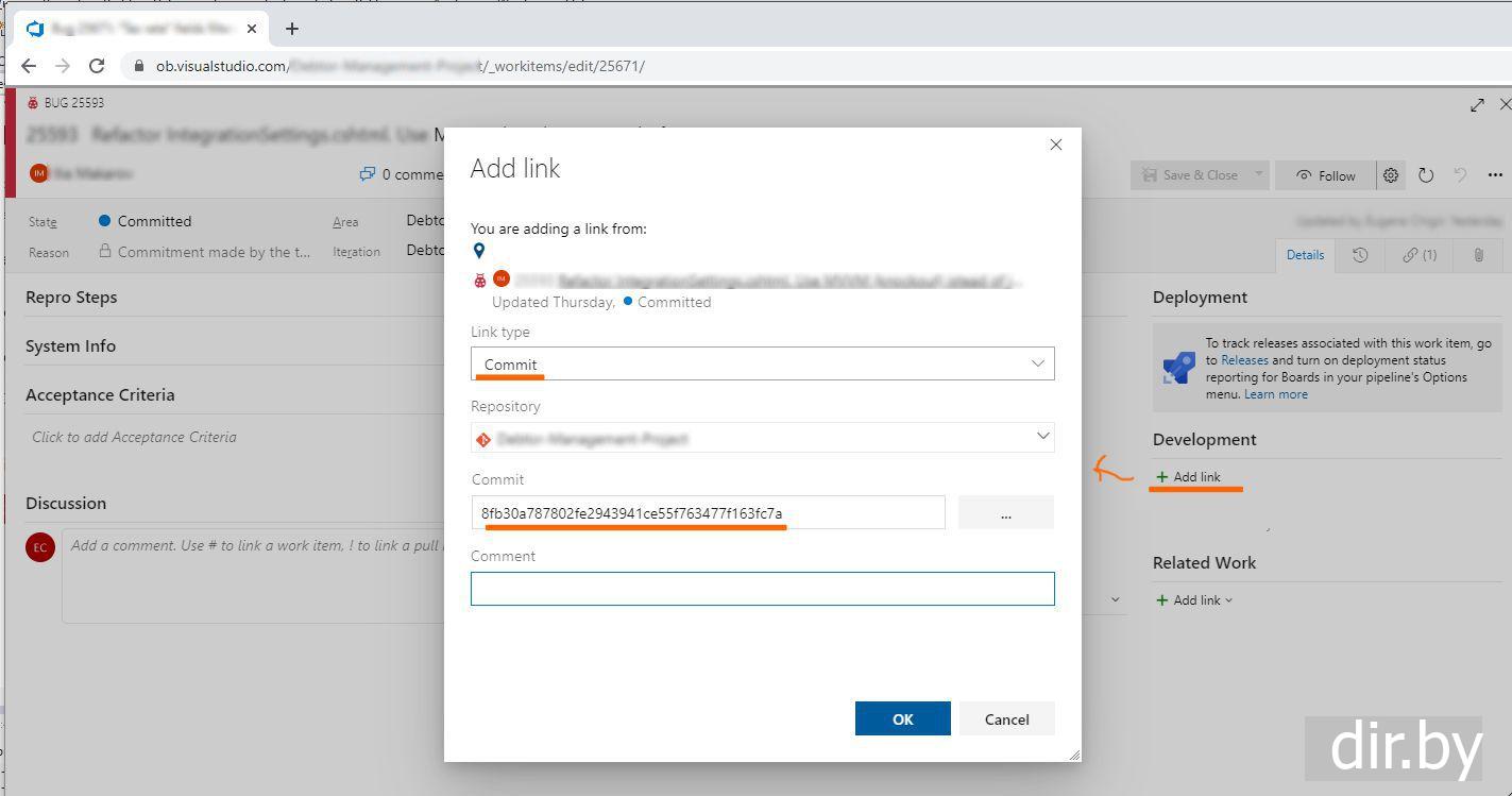 Azure DevOps. Как добавить в баг ссылку на git commit (используем commit hash)