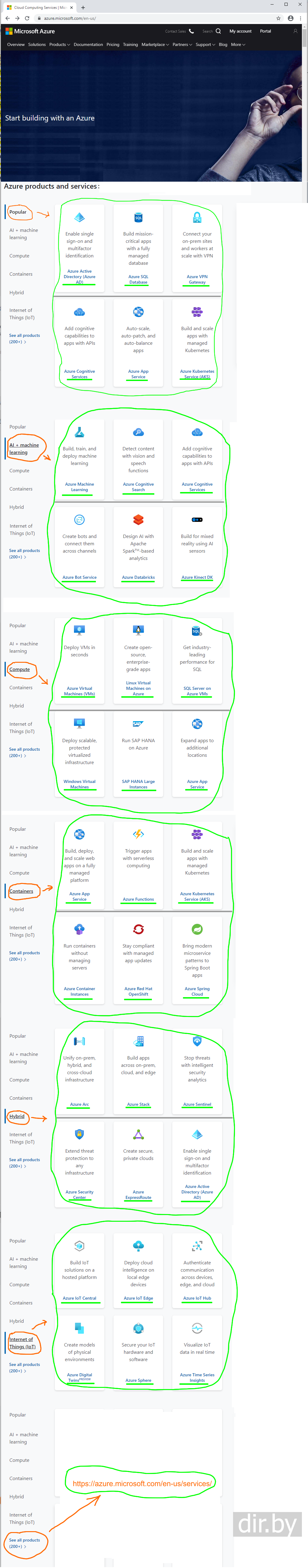 Вот сервисы Azure на Microsoft сайте: