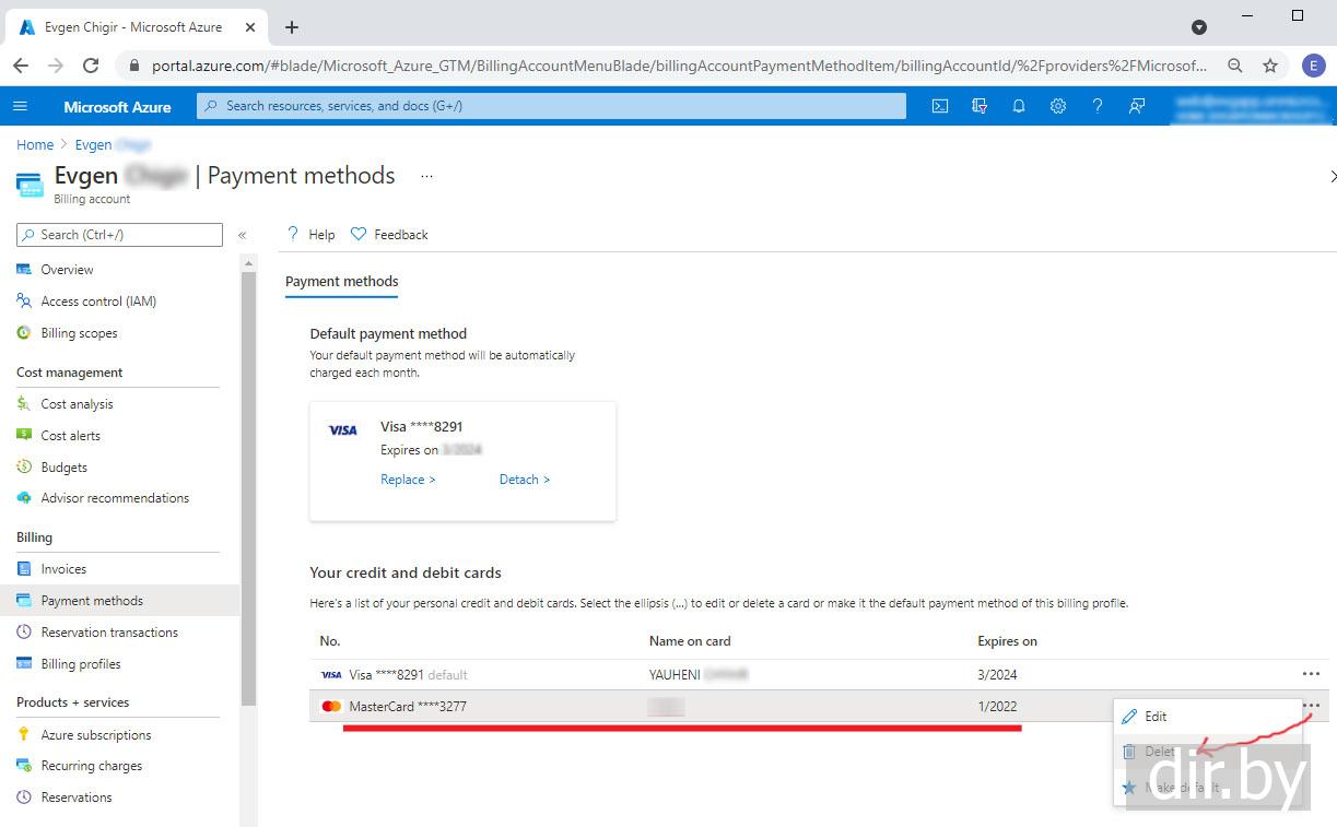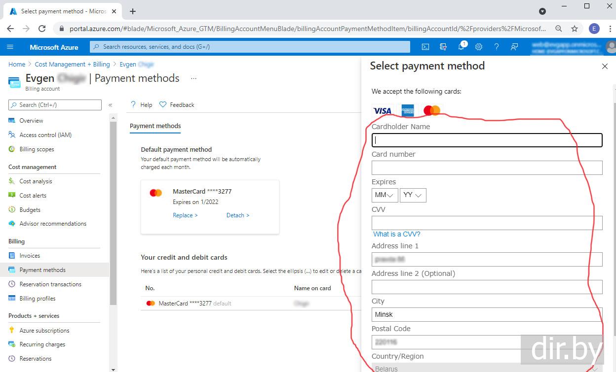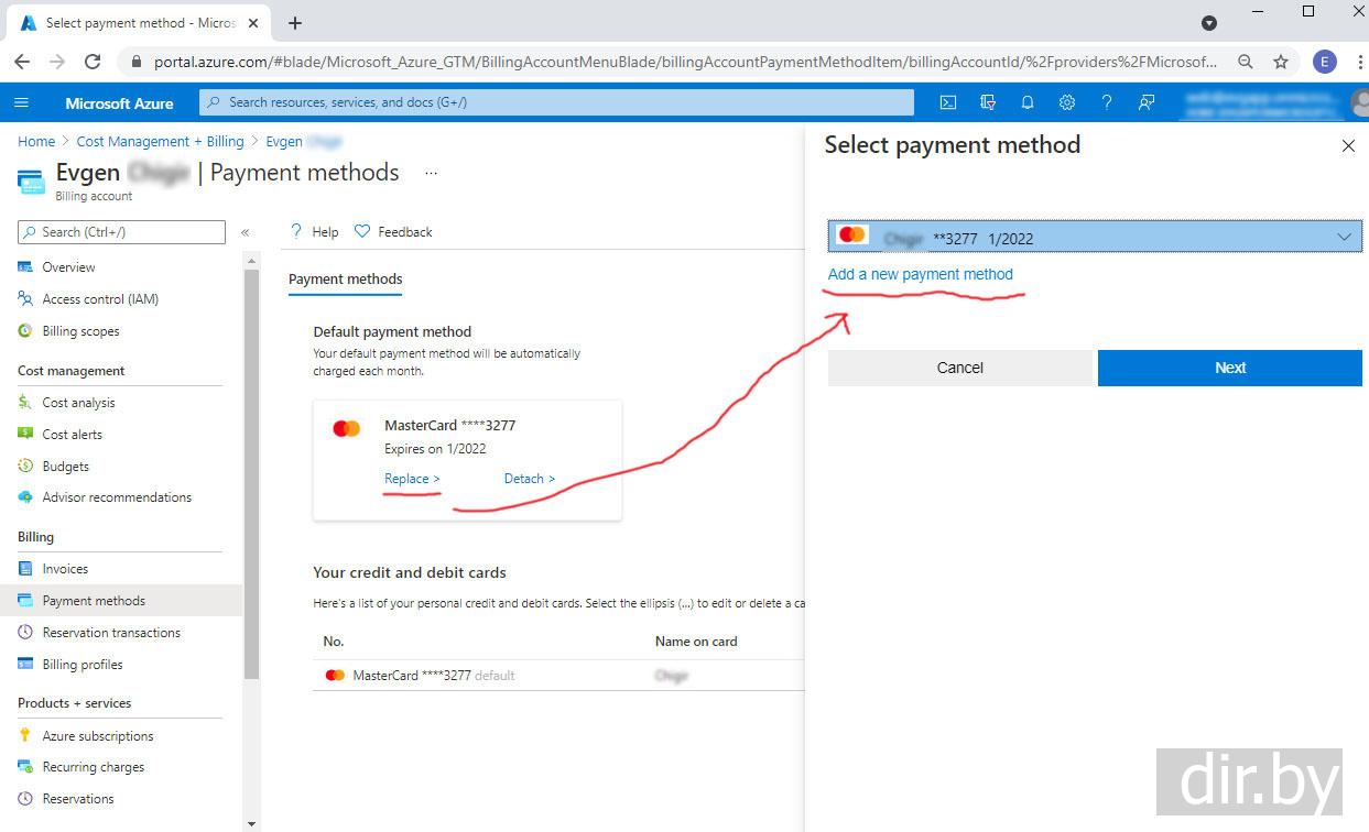Как поменять billing card number в Azure