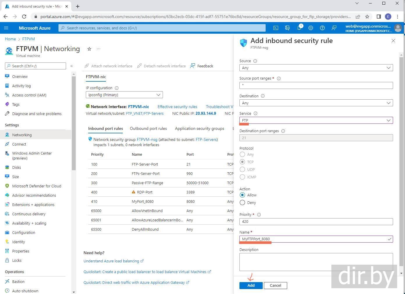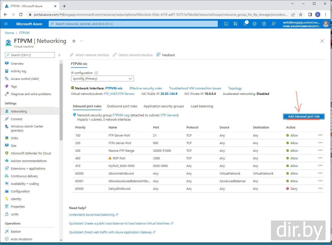 В Azure создаю port rule