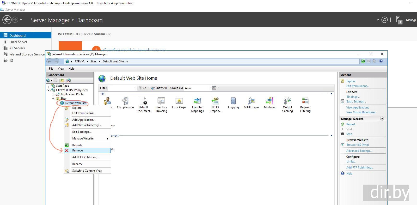 На удаленном компьютере добавляем сайт в Web Server
