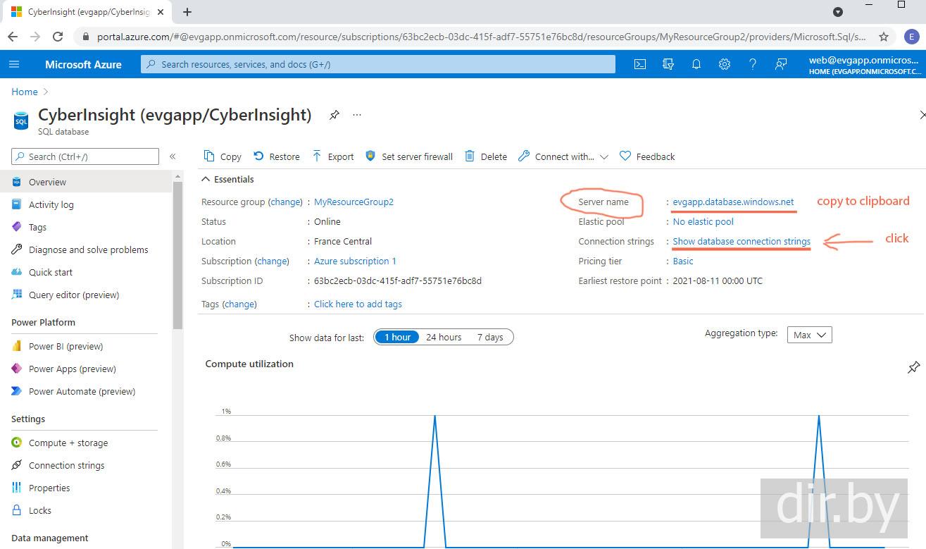 В базе данных SQL Server Azure устанавливаем самую дешевую цену (6$ в месяц Basic)