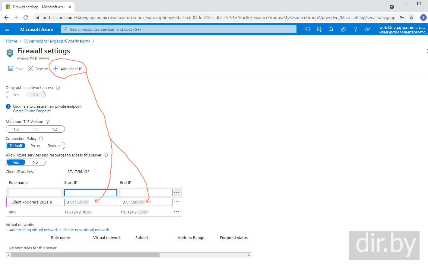Чтобы ошибки соединения к базе данных не было, нужно в Azure добавить IP address вашего компьютера
