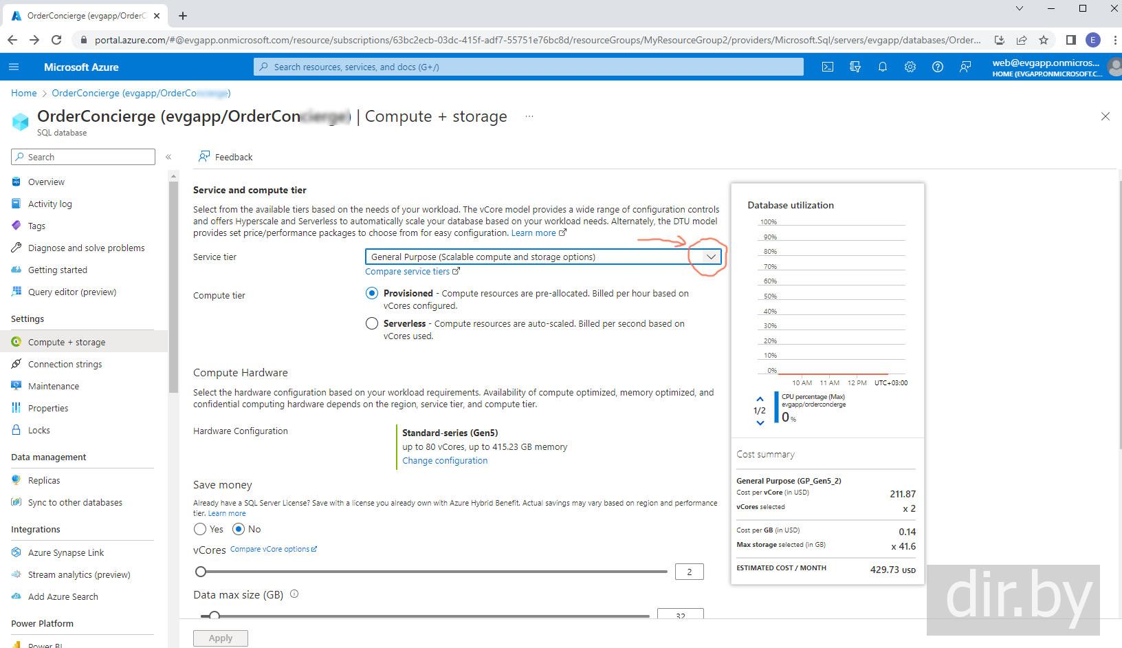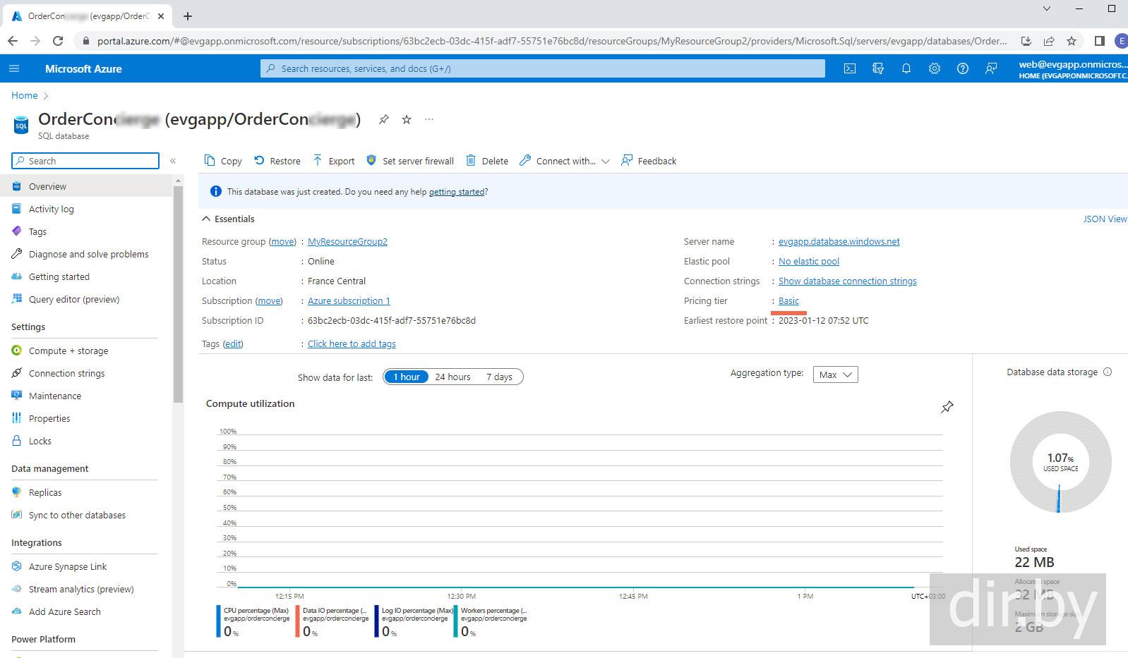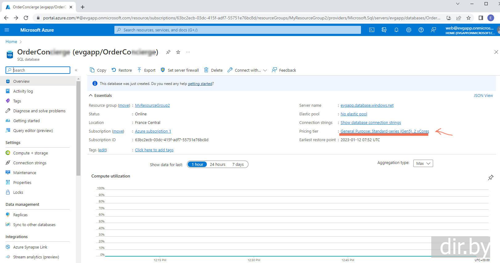В базе данных SQL Server Azure устанавливаем самую дешевую цену (6$ в месяц Basic)