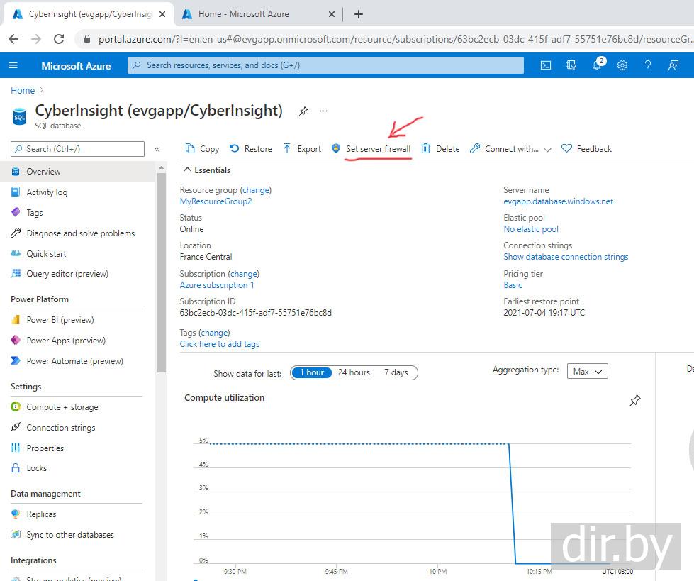 В базе данных SQL Server Azure устанавливаем самую дешевую цену (6$ в месяц Basic)