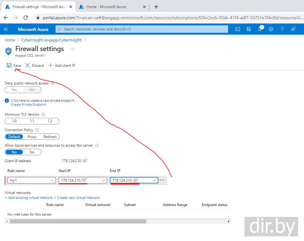 Если ошибка соединения то добавляем в Azure IP address вашего компьютера