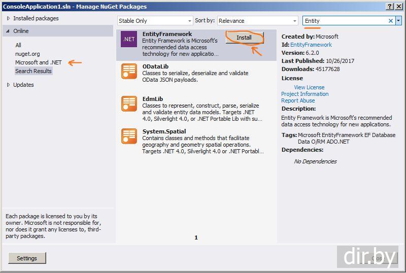 Шаг 2. Добавляем библиотеку Entity Framework используя NuGet