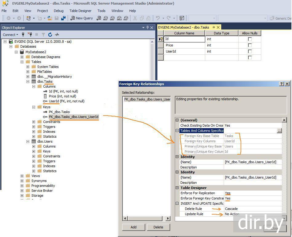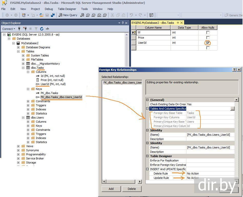 • Если внешний ключ определяется как int то внешний ключ не может иметь null значения и будет каскадное удаление.