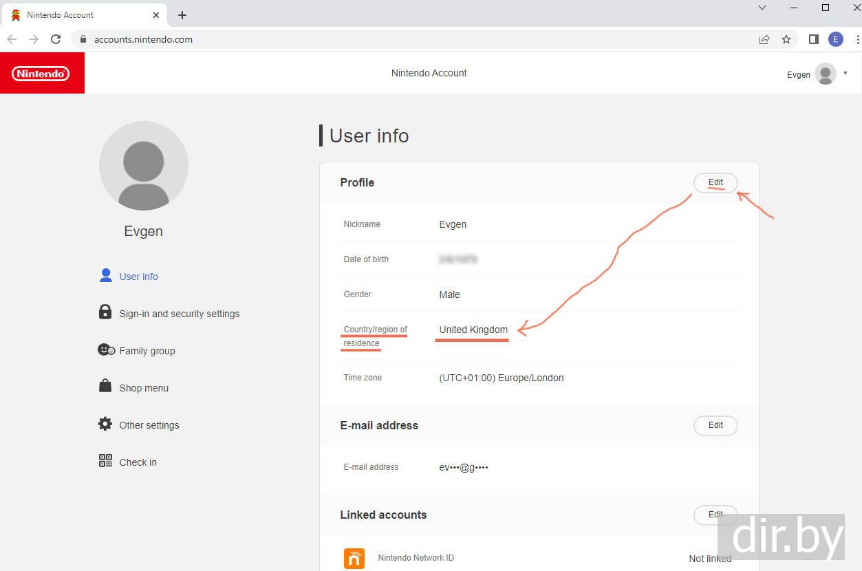 На ноутбуке захожу в Nintendo account (сайт https://nintendo.com ) и меняю страну чтобы платить в euro(€), dollar($), pound(£) при покупке игр для Nintendo Switch
