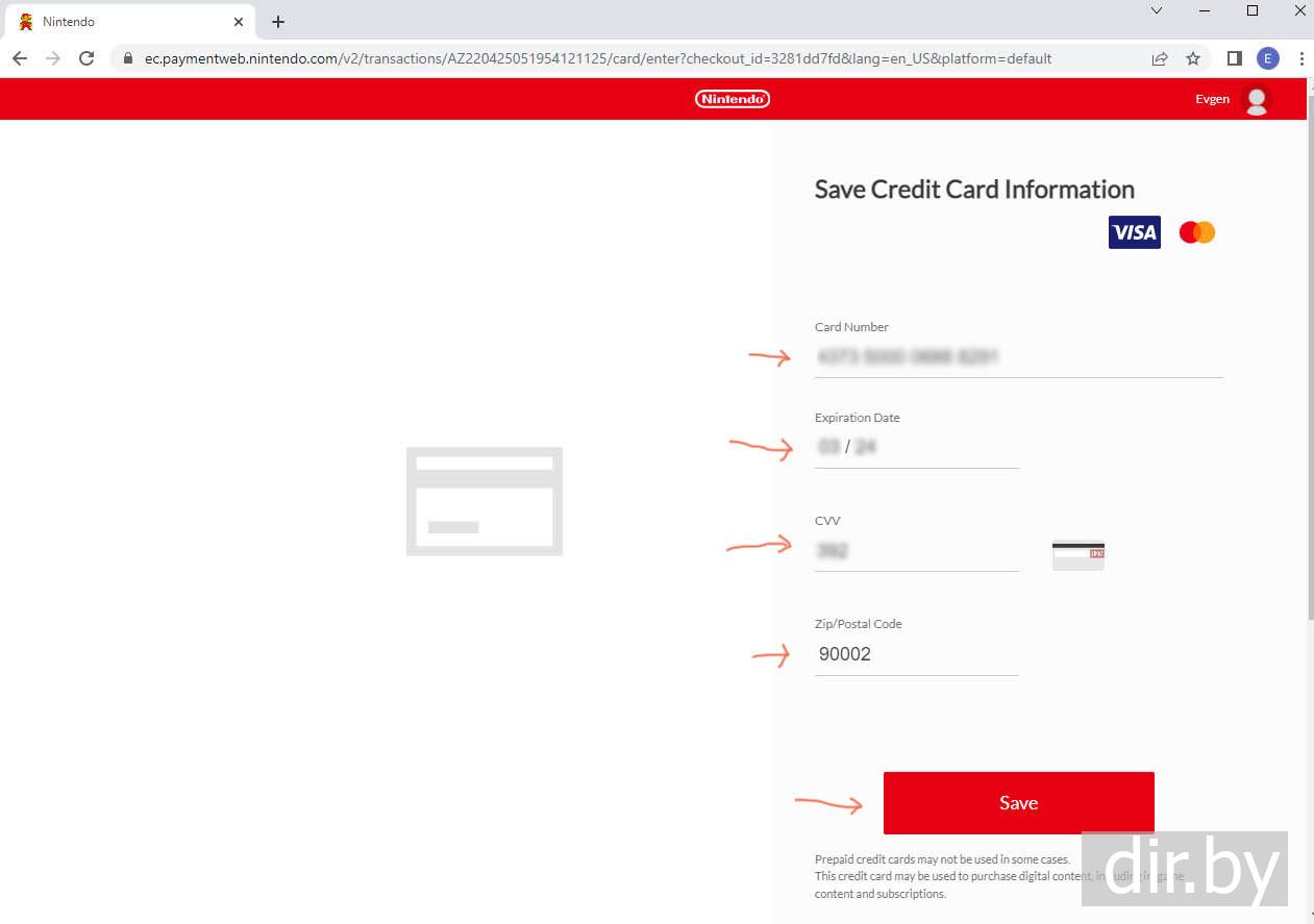 На ноутбуке захожу в Nintendo account (сайт https://nintendo.com ) и добавляю платежную карточку