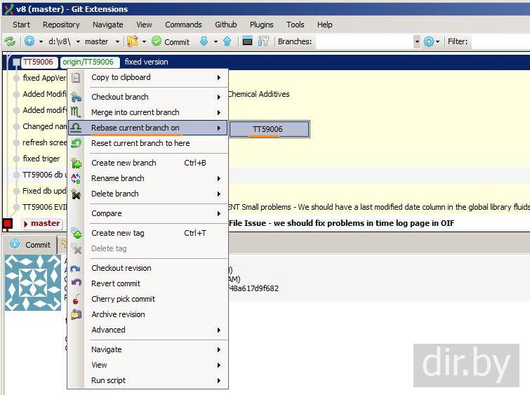 Вариант 2 (используем Rebase, Reset). Выложить нашу ветку (branch) в master ветку. Git Extensions для Windows