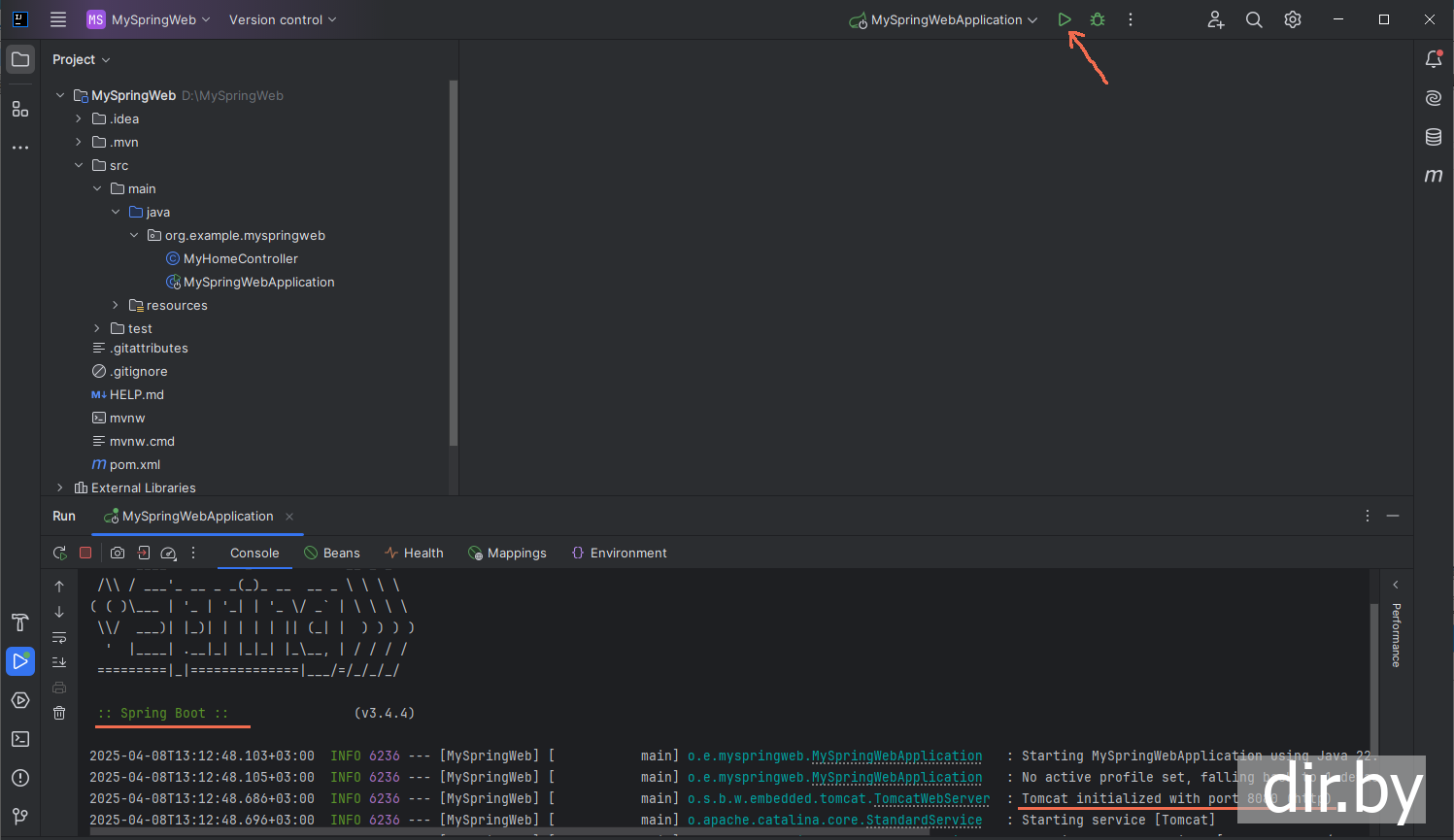 2) дальше запускается Tomcat web сервер с портом 8080 (потому что в файл pom.xml добавили <dependency> ... spring-boot-starter-web ... </dependency> )