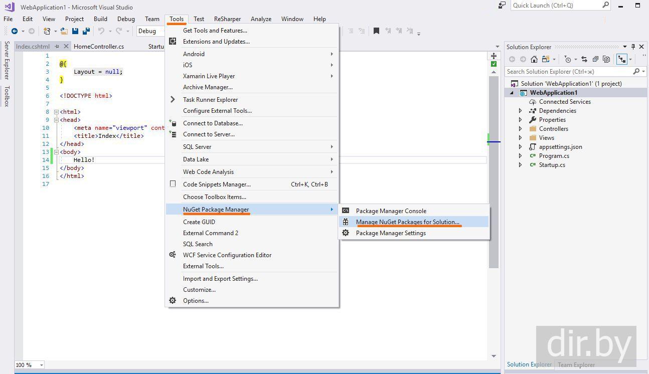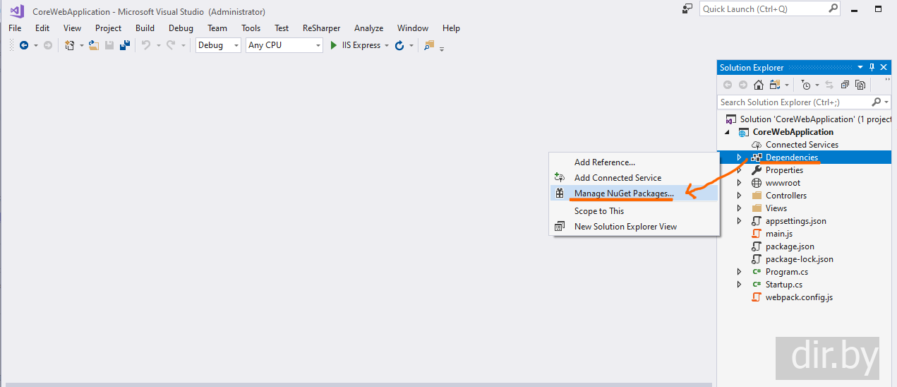 Шаг 3. В Visual Studio 2017 на проекте в dependencies нажать на Manage NuGet Packages