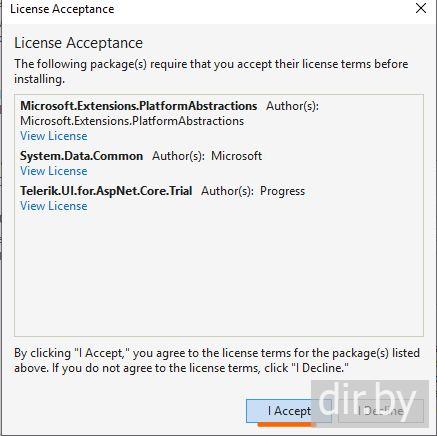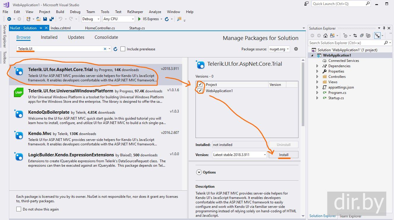 Устанавливаем package Telerik.UI.for.AspNet.Core с помощью Nuget в Visual Studio