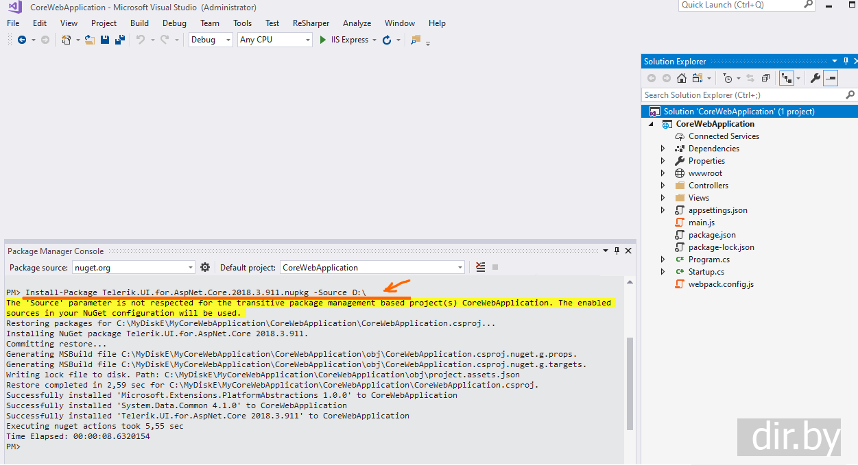 Устанавливаем package .nupkg файл (Telerik.UI.for.AspNet.Core.2018.3.911.nupkg) с компьютера в проект Visual Studio 2017