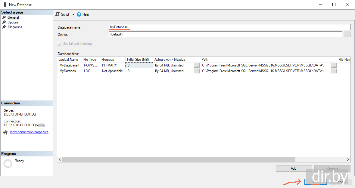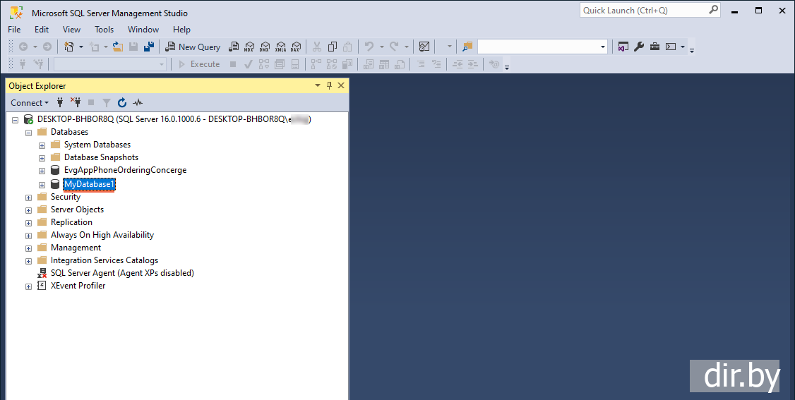 Я закрываю SQL Server Management Studio и открываю и вижу что база данных MyDatabase1 создана