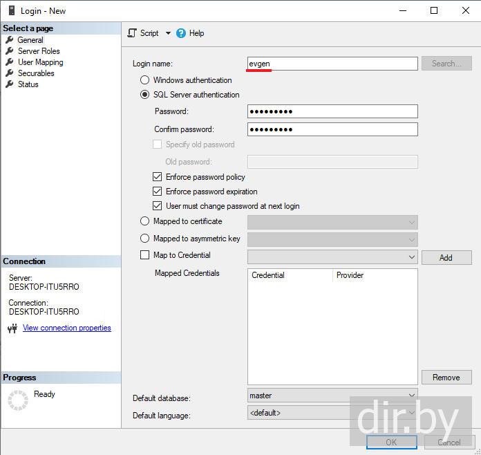 Create user "evgen" for Sql Server in Microsoft SQL Server Management Studio