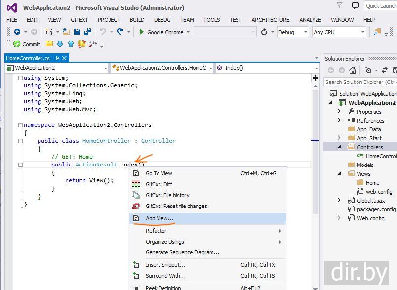Нажимаем правой клавишей мыши по методу Index в файле HomeController.cs и нажимаем на Add View ...