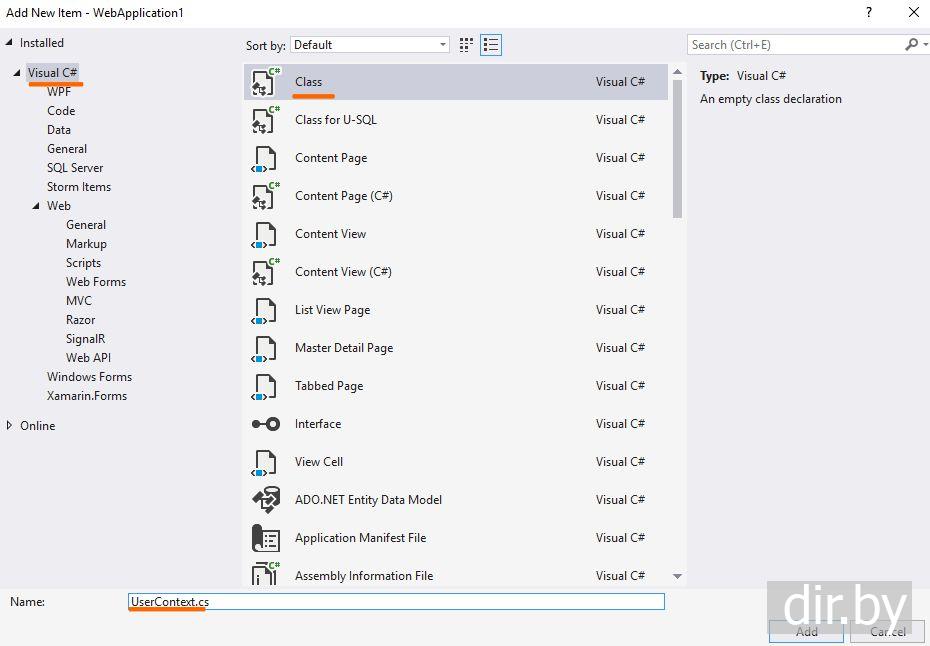 Шаг 5. Добавим файл UserContext.cs в папку Models (класс User и класс UserContext для работы с Базой данных)