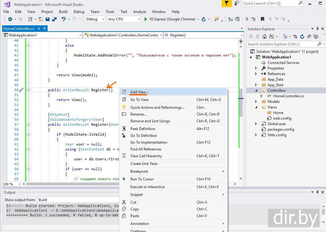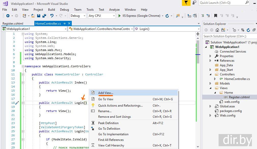 Нажимаем правой клавишей мыши по методу Register в файле HomeController.cs и нажимаем на Add View ...