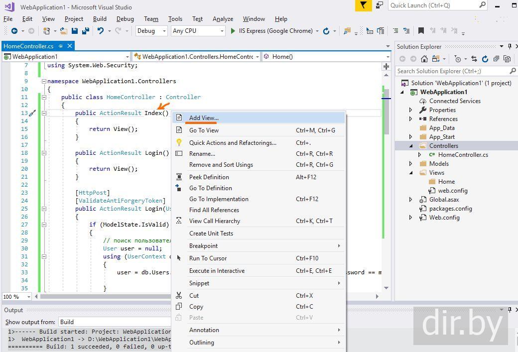 Нажимаем правой клавишей мыши по методу Index в файле HomeController.cs и нажимаем на Add View ...