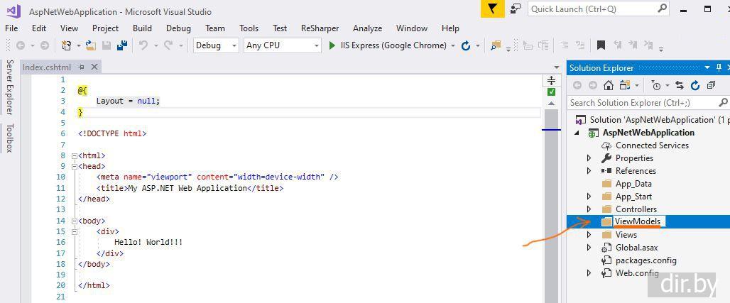 Создаем папку ViewModels. Создаем свой класс в папке ViewModels. Это хороший стиль программирования для передачи данных из Controller во View. Web приложение ASP.NET MVC