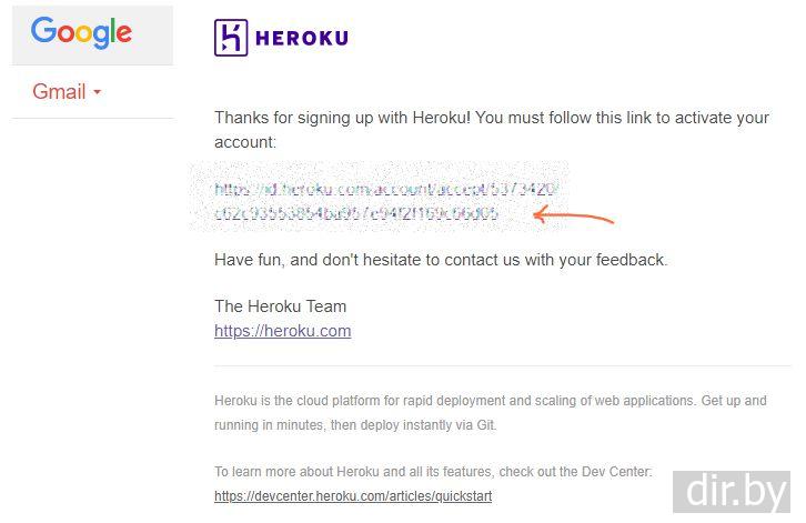 Открываем почту и находим письмо "Confirm your account on Heroku"