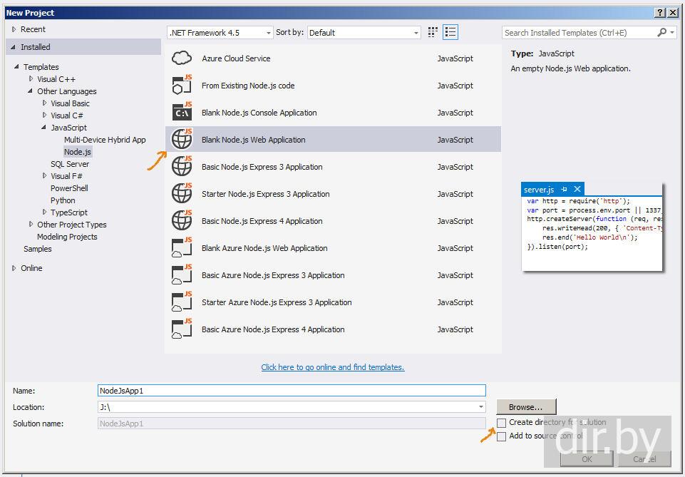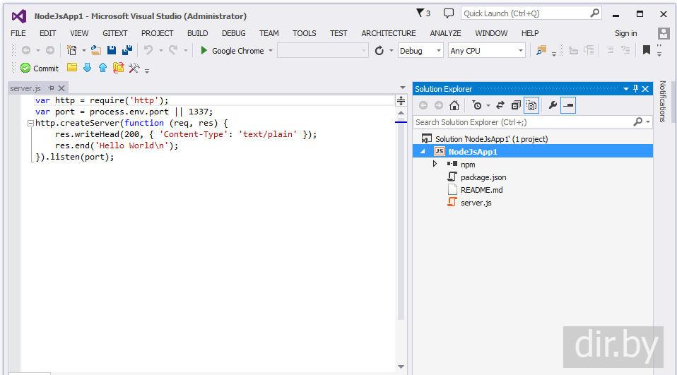 Visual Studio 2017 позволяет использовать встроенную отладку для Node.js проектов.