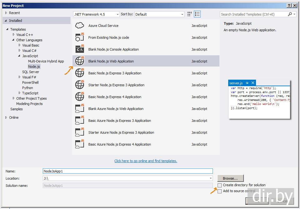Новый Node.js проект (проект создаем в Visual Studio)