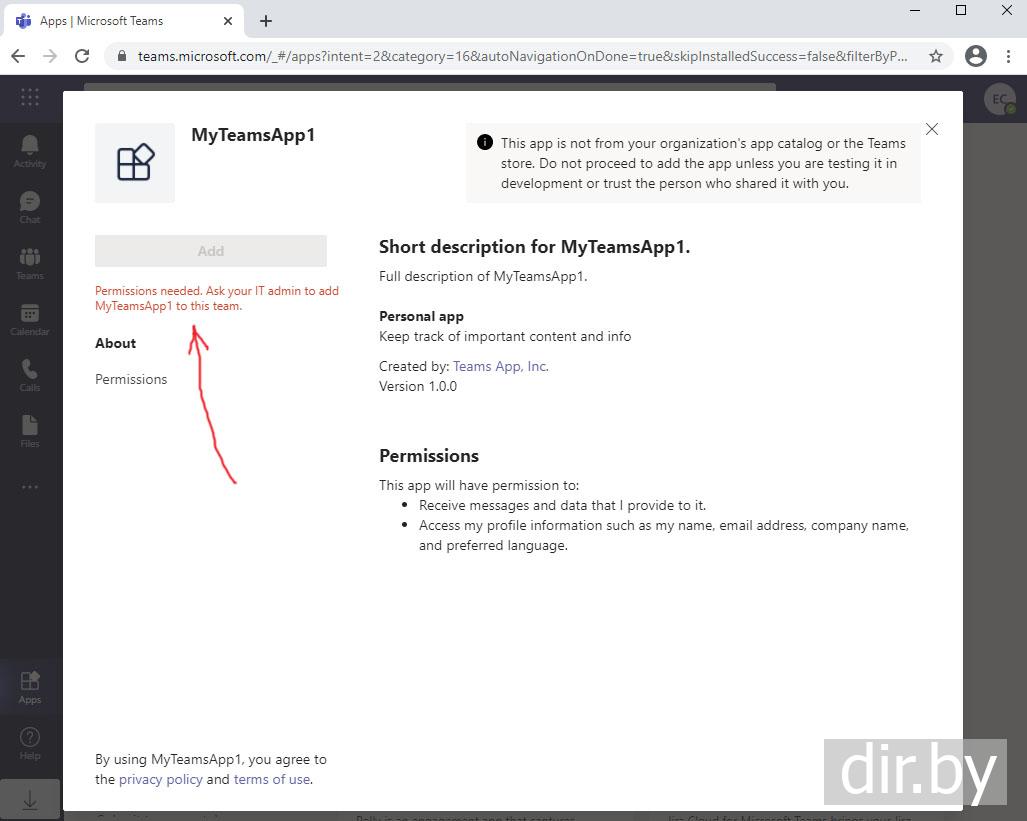 Исправляем ошибку "Permissions needed. Add your IT admin to add MyTeamsApp1 to this team"