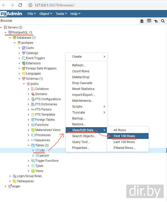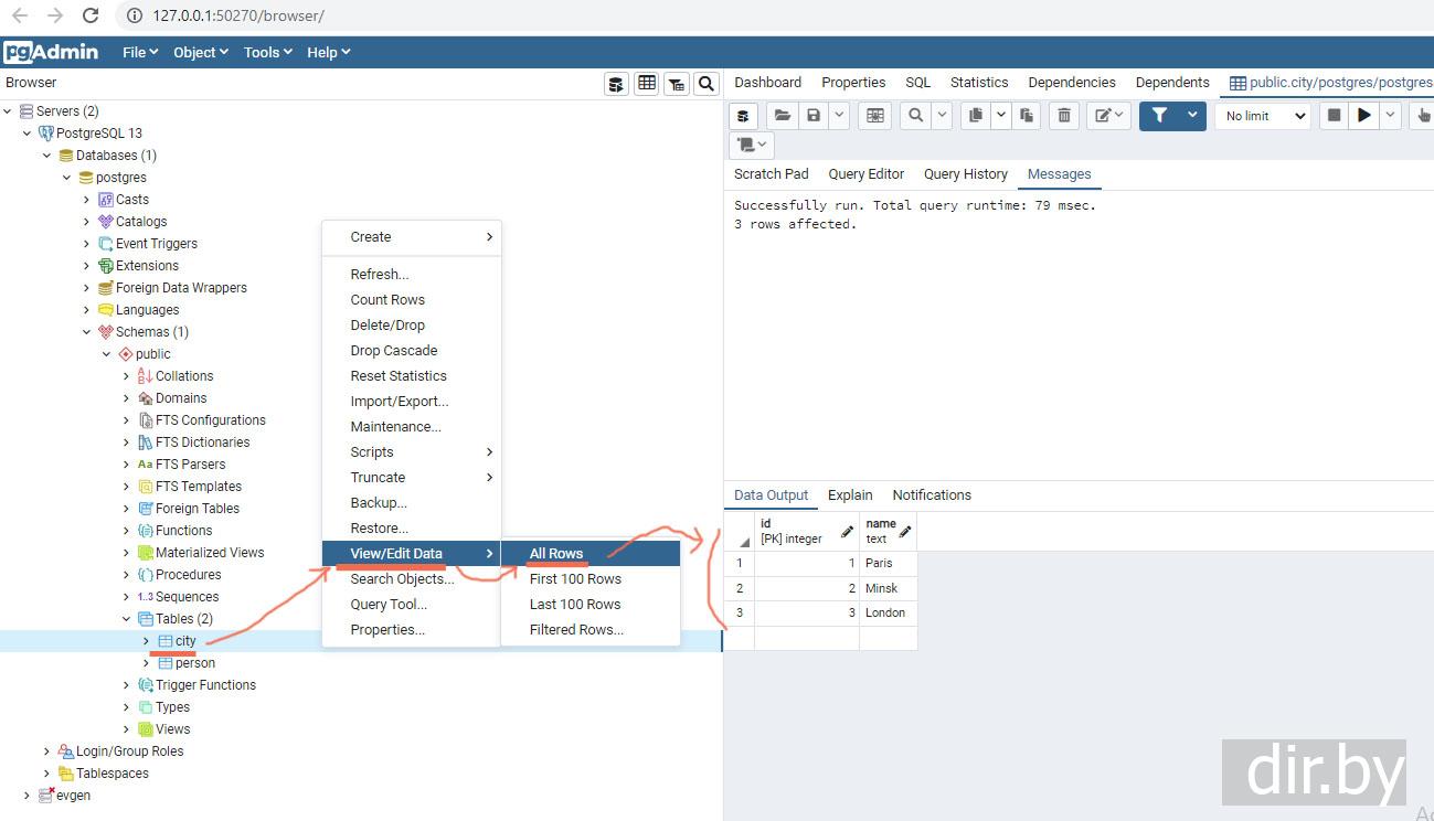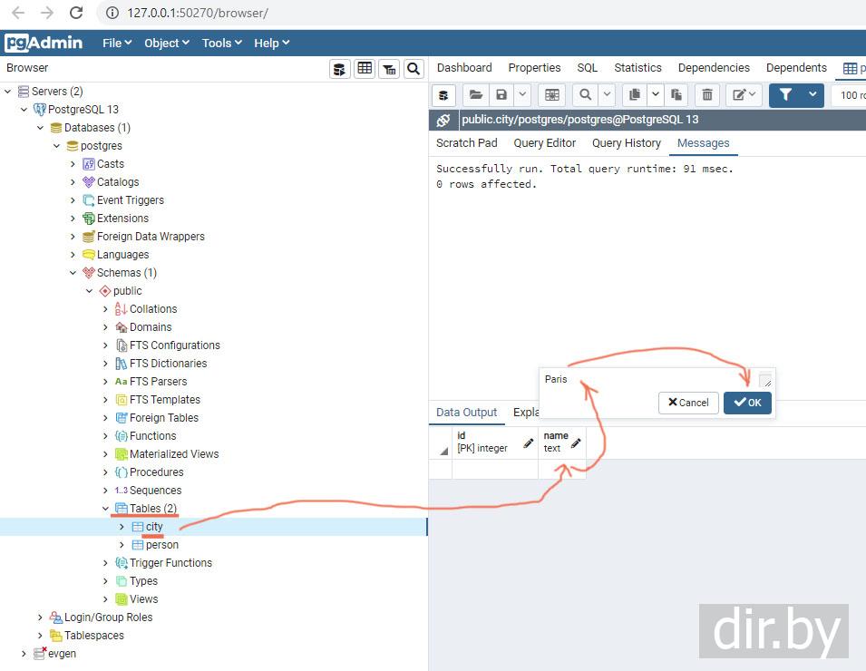 Добавляем данные в таблицу "city" (используем pgAdmin, сервер PostgreSQL)