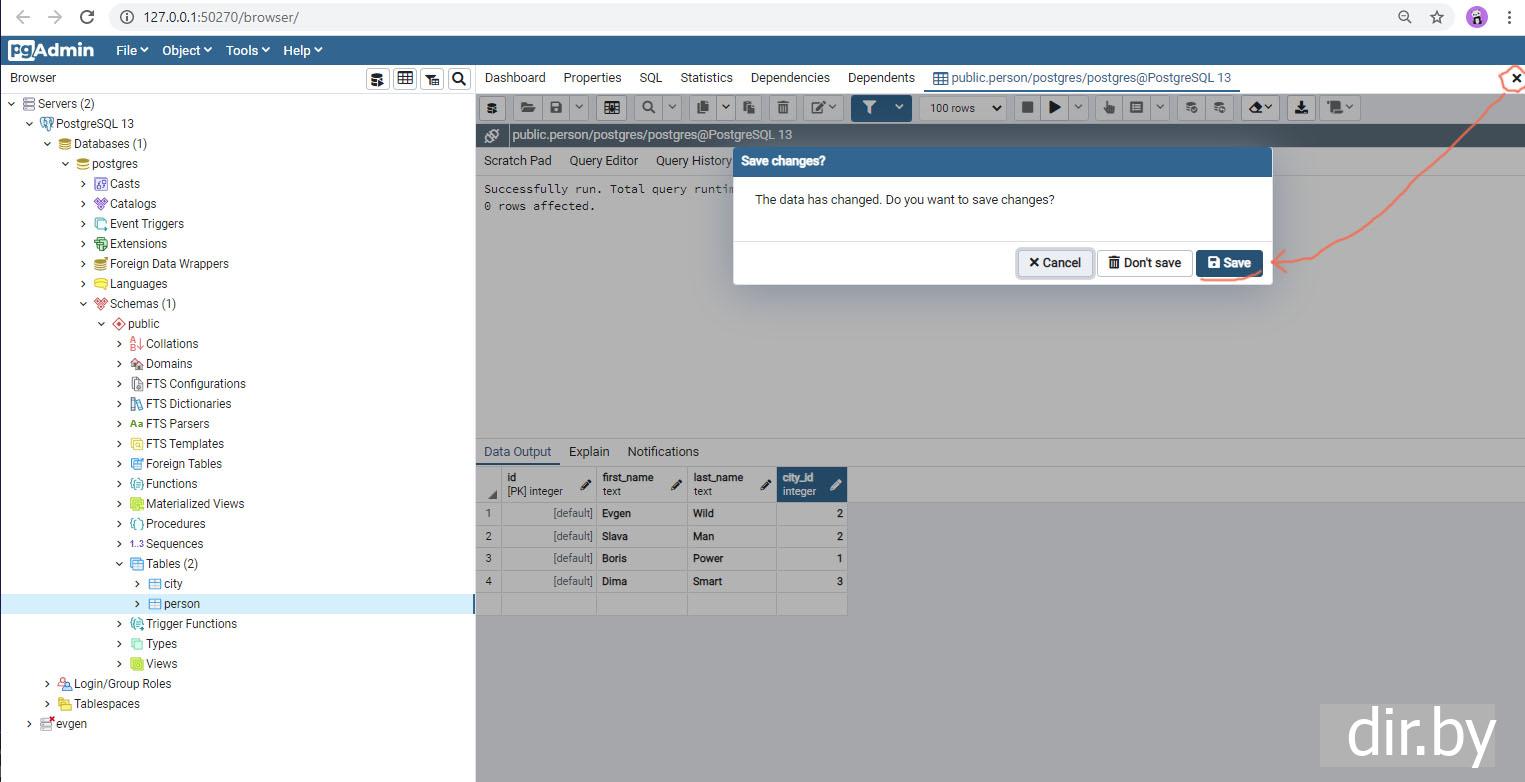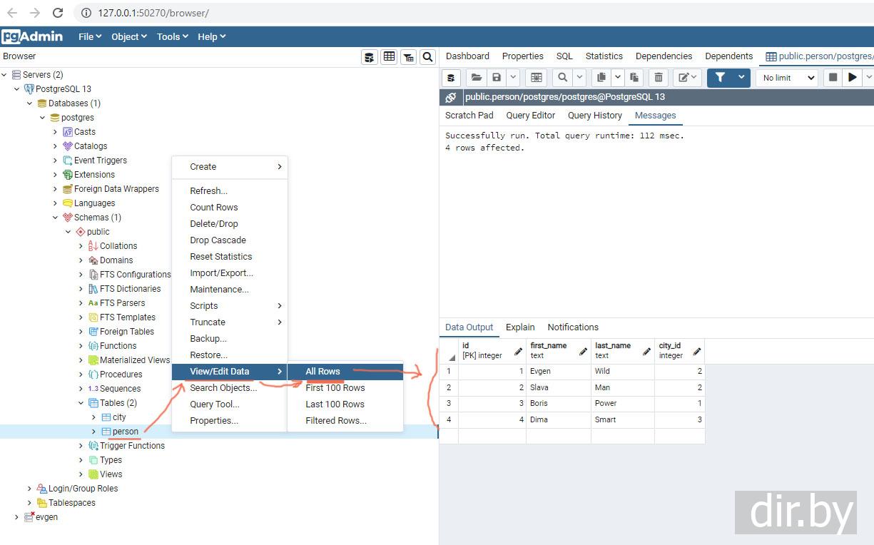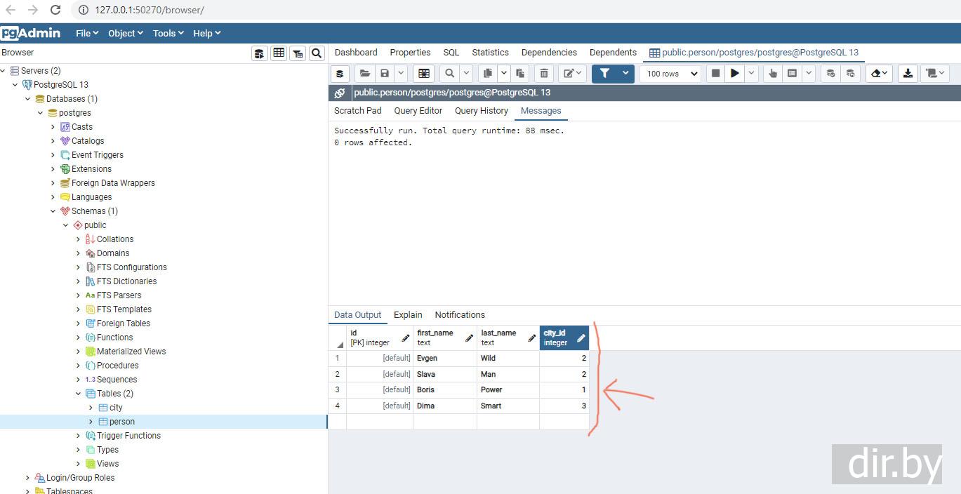 Добавляем данные в таблицу "person" (используем pgAdmin, сервер PostgreSQL)