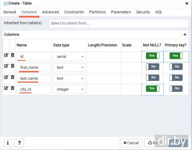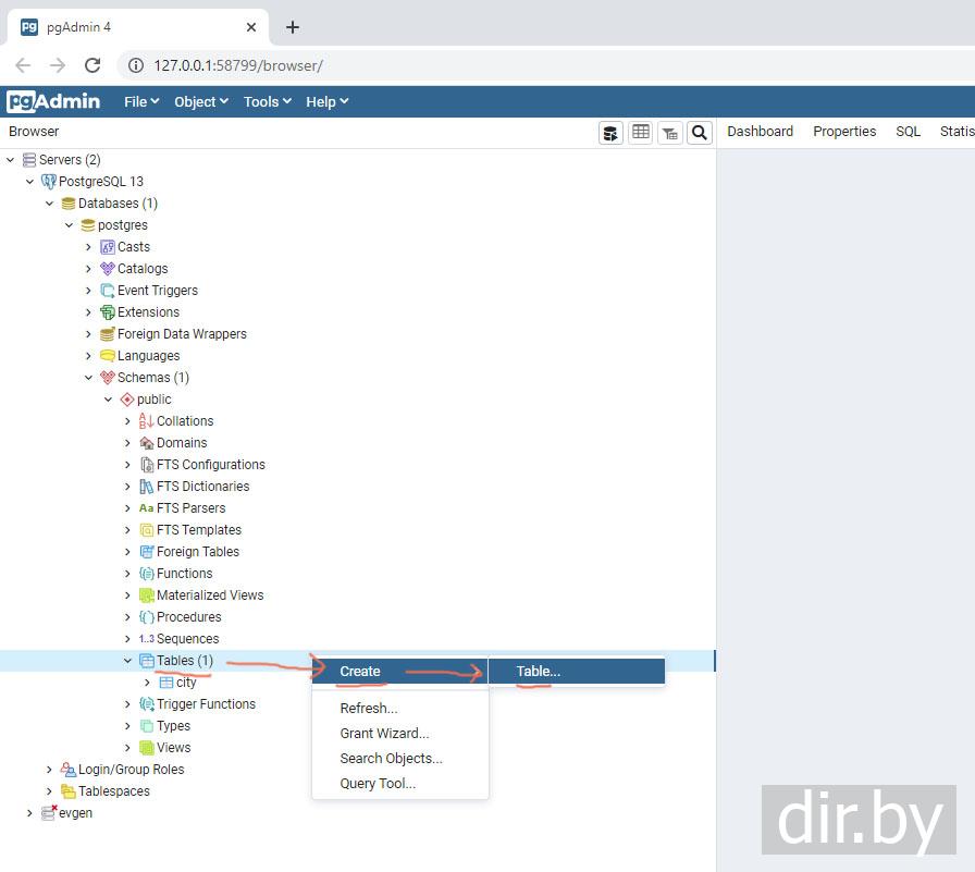 Создаем таблицу "city" (используем pgAdmin, сервер PostgreSQL)