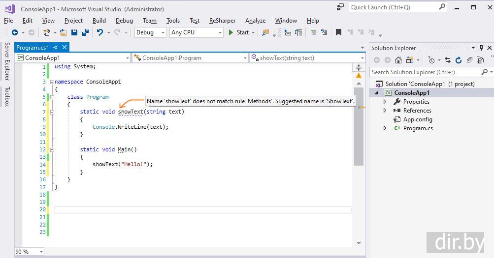 ReSharper warning "Name 'showText' does not match rule 'Methods'. Suggested name is "ShowText"." | C# console project in Visual Studio 2017