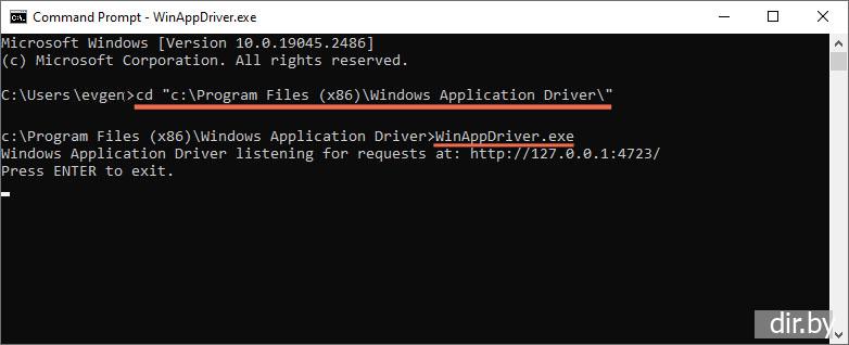 Шаг 2. Запускаем WinAppDriver выполнив команды