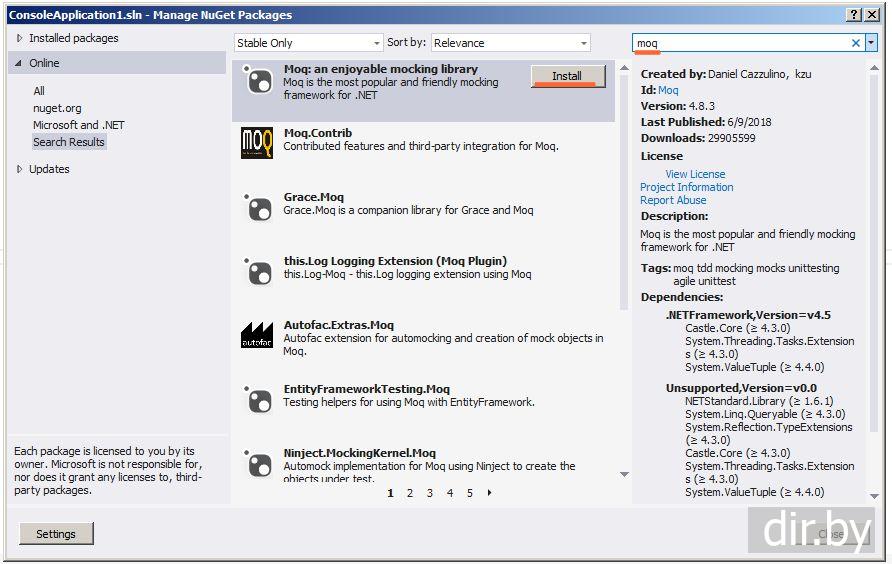 Пишем moq и нажимаем Install