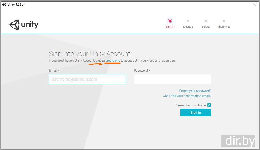 При запуске Unity появляется форма для заполнения email и password. Поэтому создадим Account Unity