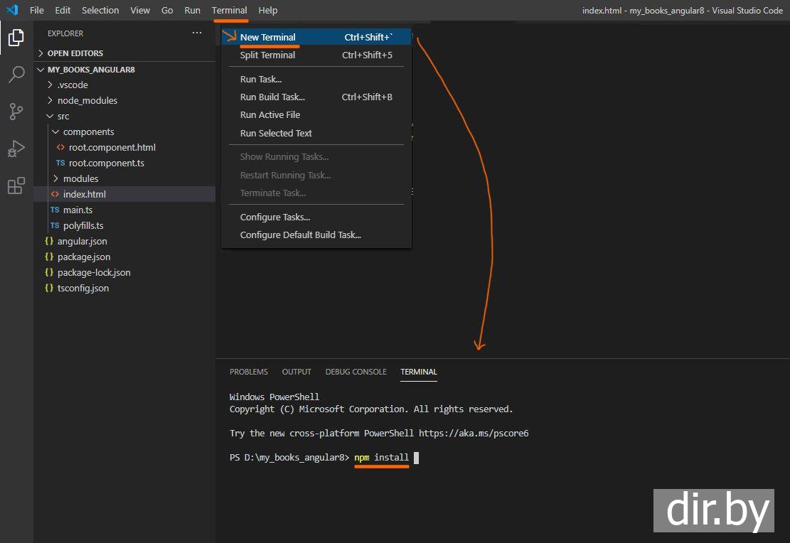 New Terminal in the menu that shows a line for executing console commands.