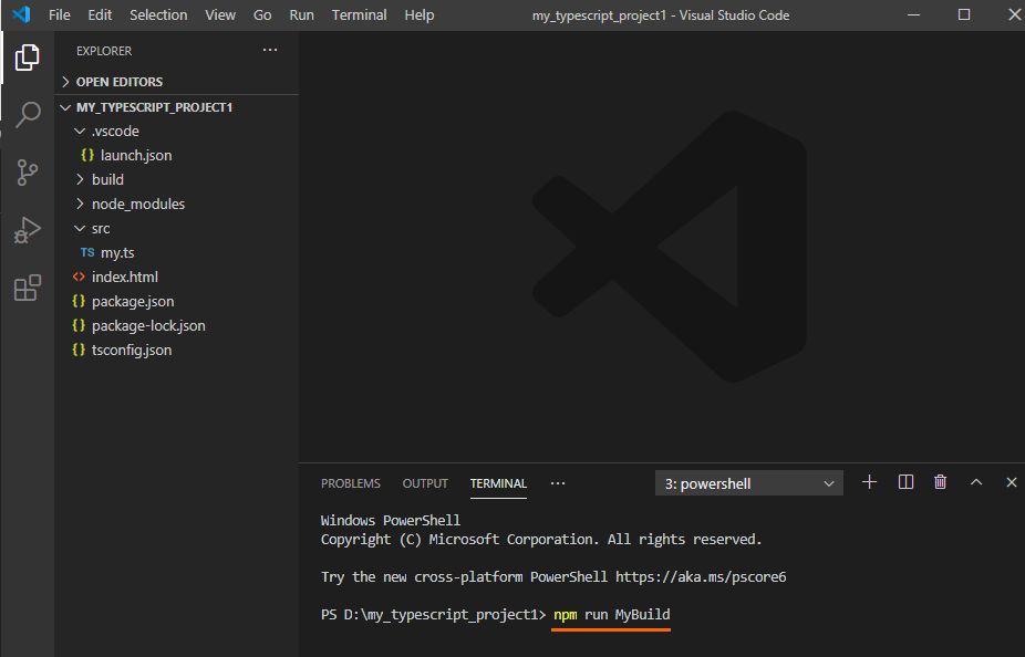 Шаг 9. Компилируем проект (выполним npm run MyBuild для конвертации файла ts в js)