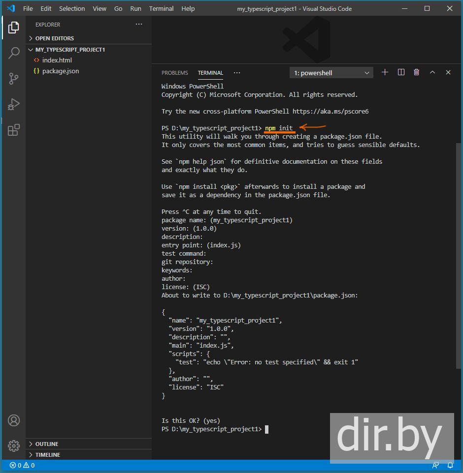 Шаг 4. В терминальной строке выполним npm init для создания файла package.json